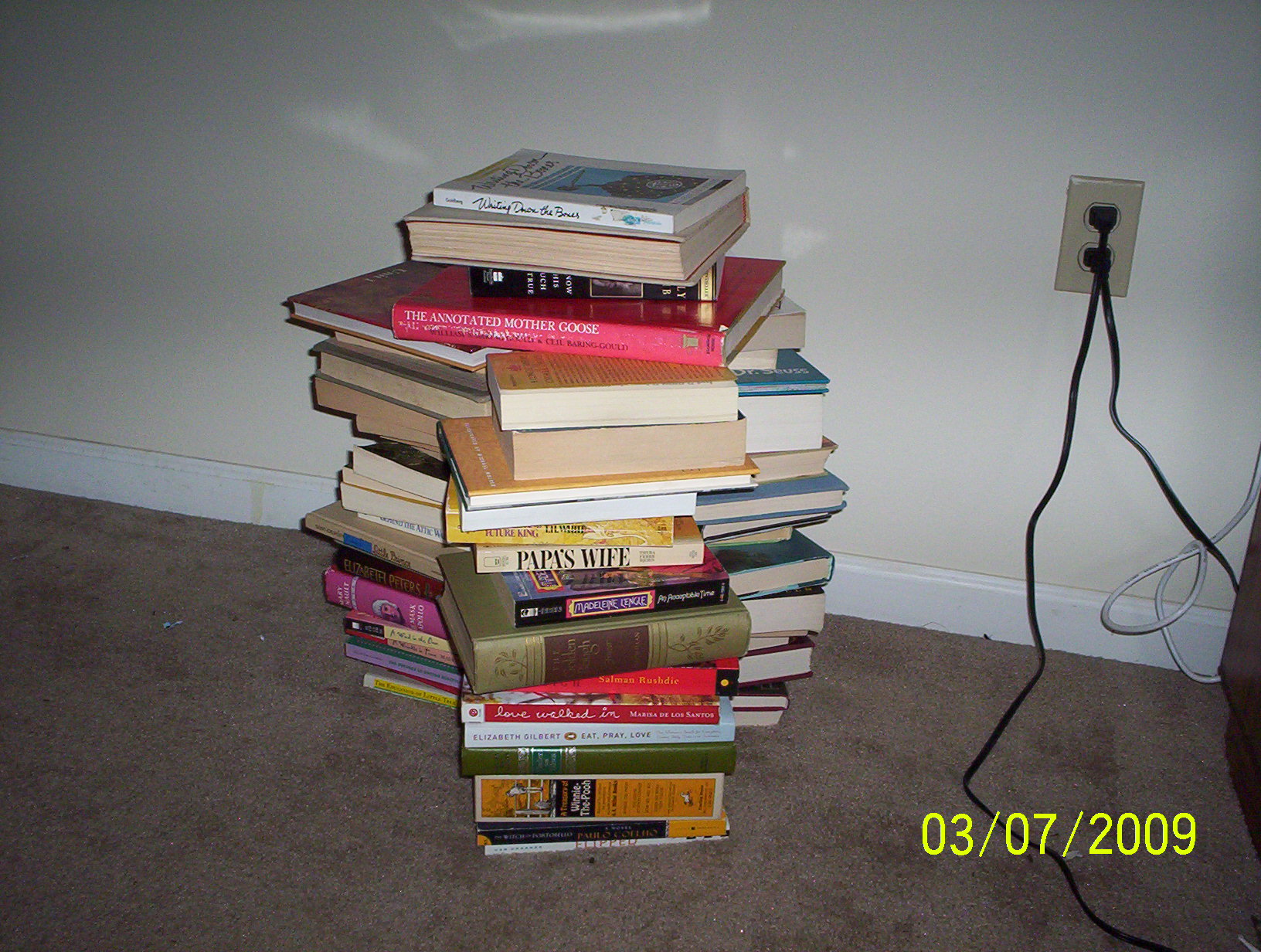 I’m going to have to write a nice letter to my work. They gave me this bookshelf because I asked for it, and if they hadn’t, I wouldn’t have bought all these books. I am not wont to let myself go like this, just buying books ceaselessly like a fiend. Ordinarily I don’t buy books unless I am pretty sure I am going to like them. Ordinarily I am swayed by considerations of money and shelf space – don’t want to waste precious shelf space on books I might not like. But this year I got every book I saw that I wanted, and I did not worry about whether I would love each and every one, or whether it was a waste of money. I just bought books like crazy. A bunch of the volunteers there knew me by the end of Saturday, and my picture is up on the university website.