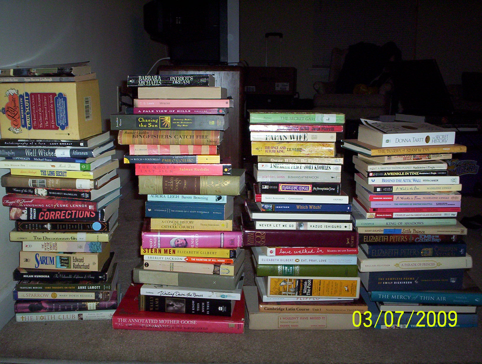 Then today I went over there with my sister and her boyfriend, and we went in the afternoon, and while I was shopping, the volunteers working there shouted out that all the books were now half off their listed price. So I got another box full of books, and this is what I ended up with:
